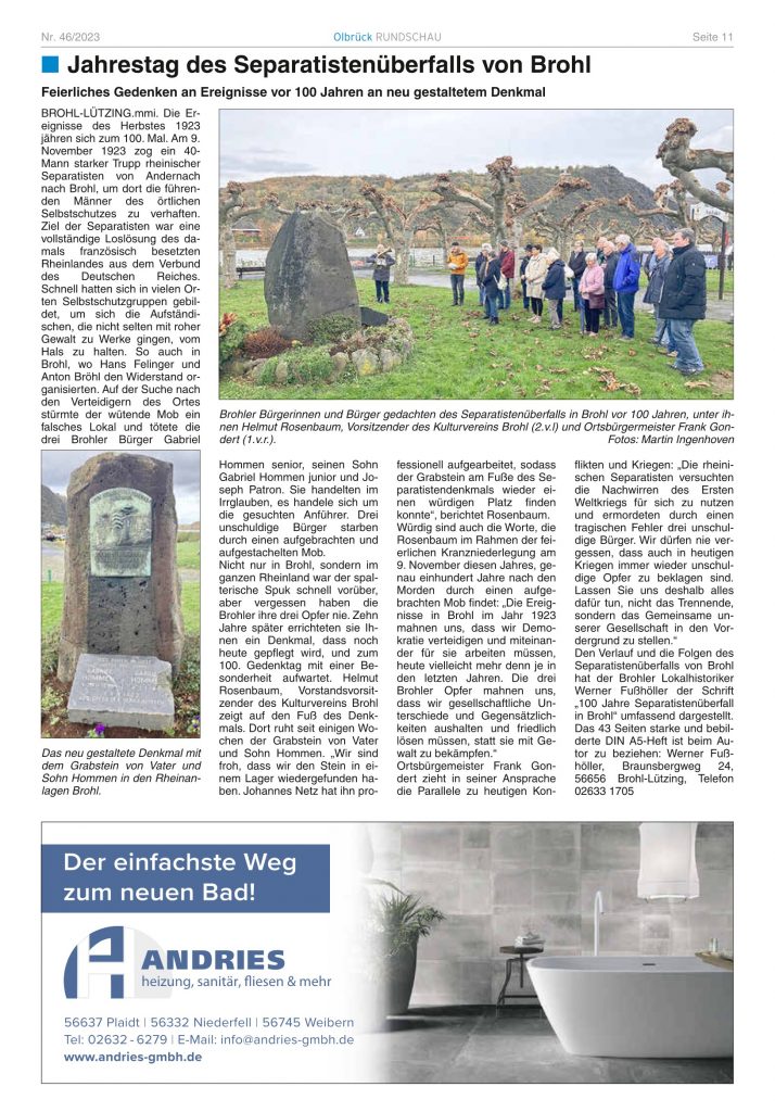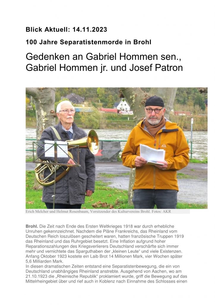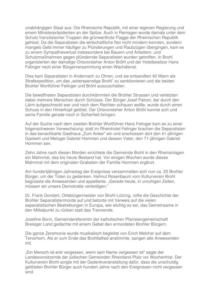 Jakob Mennen denkt dabei an den einstigen Ortsvorsteher Bernhard Kraus und die Nazi-Blockwart Peter Schmidgen. Die beiden haben heimlich unterstützt, wo sie konnten…“. Also: Auch das gab es. Der von den Berichten der Mennen-Brüder tief beeindruckten Zuhörerschaft erläuterte Helmut Rosenbaum, Vorsitzender des in die Organisation der Gedenkveranstaltung eingebundenen Museumsvereins „Aalschokker Katharina“, einige zusätzliche Details zur Entwicklung des einstigen Judentums in der Region Breisig/Brohl. Er dankte in diesem Zusammenhang der Familie Lerchl, dass sie der Anbringung der Gedenktafel an ihrem Wohnhaus zugestimmt habe. Ortsbürgermeister Michael Schäfer dankte dem Initiator Ivo Dubiel, dem Museumsverein, den beiden die Veranstaltung musikalisch schmückenden Instrumentalisten Frank Weiß und Rudolf Mennen, ihnen allen für die Idee zu dieser Veranstaltung. Christoph Schnitger deckte in Vertretung von Pastor Marmann den geistlichen Part der Gedenkstunde ab und sprach mit dem Auditorium einige Gebete in Gedenken an die Opfer des Nazi-Torrors.