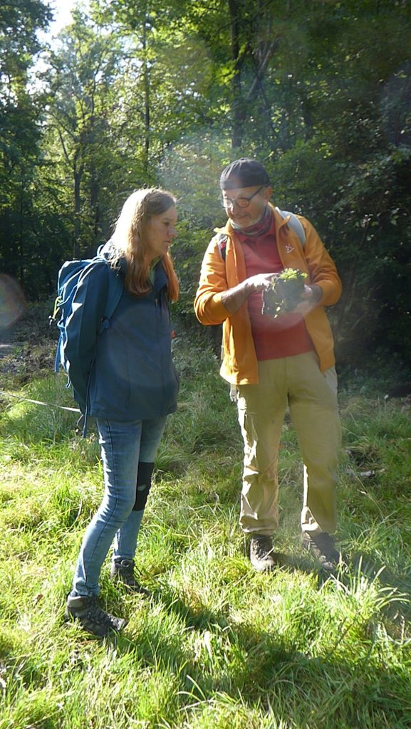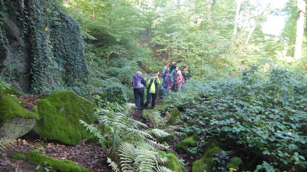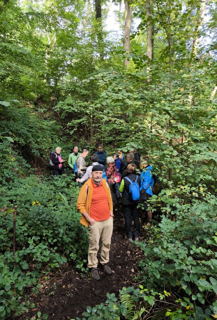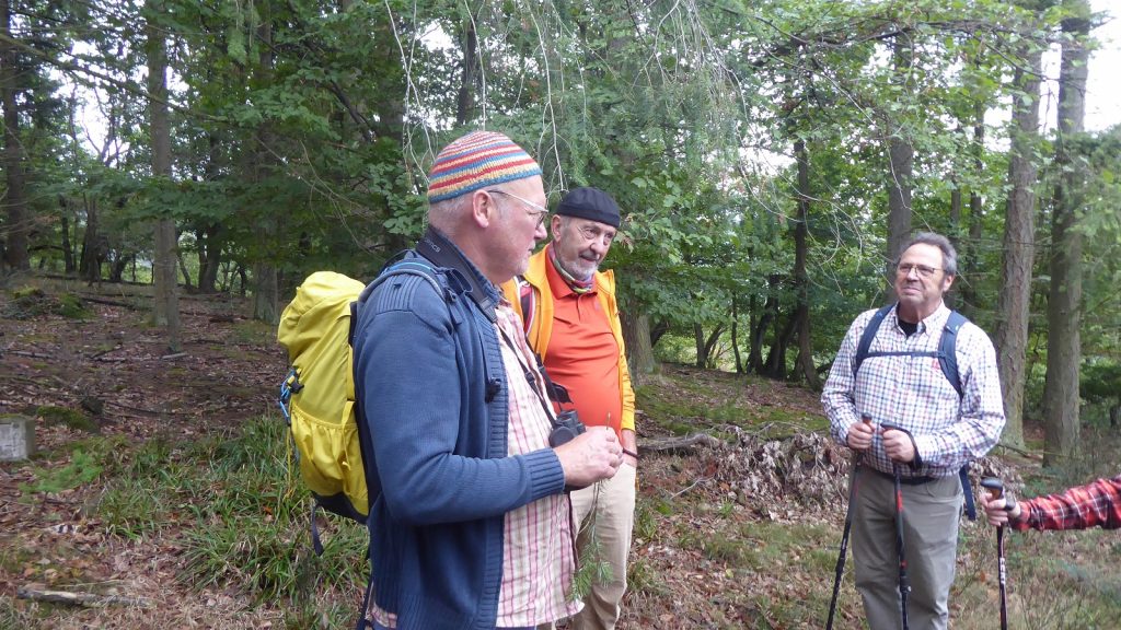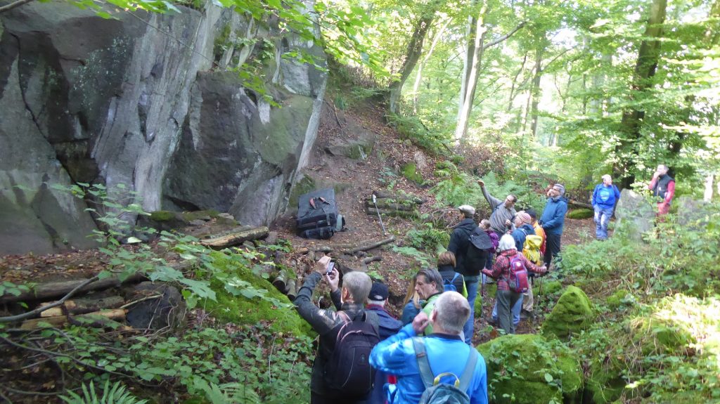 Auch im biologischen Teil gab es Interessantes zu entdecken und zu hören. Dr. Thomas Wagner erläuterte nicht nur die vorhandene Vegetation am Wegesrand, sondern ging in dieser Führung auch auf die Auswirkungen durch die Klimaveränderung ein. Einleuchtend schilderte er die Symbiosen zwischen Bäumen, Pflanzen und der Tier- und Insektenwelt. Am Beispiel des Fichtensterbens verdeutlichte er, dass damit das Aussterben der Tannenmeise und des Wintergoldhähnchens einhergehen. Diese negative Sichtweise bedeutet andererseits, dass durch die zukünftige geänderte Forstwirtschaft andere Baumarten wieder zu mehr Artenvielfalt führen werden.
