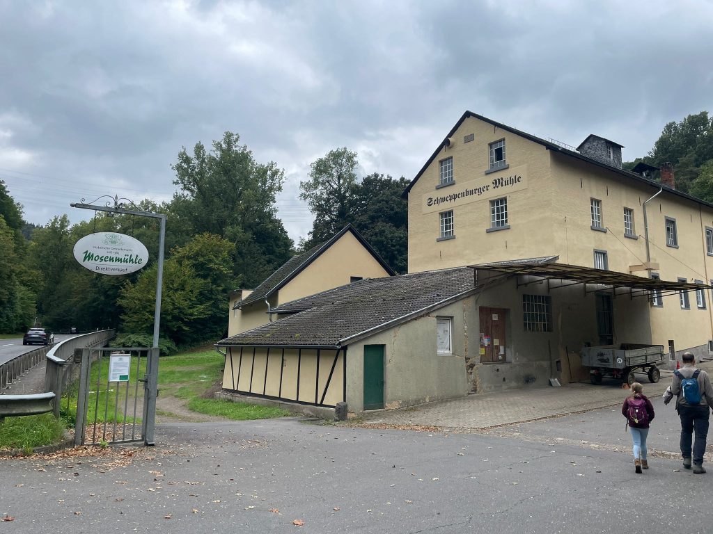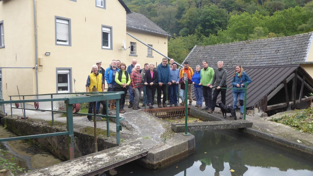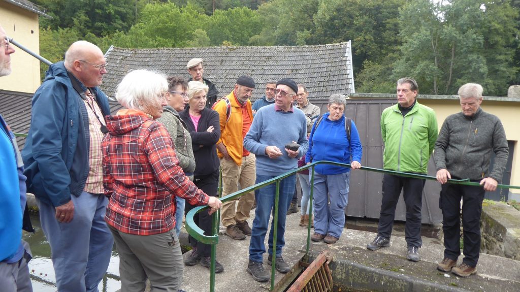 Müllermeister Rainer Mosen, der selber an der Exkursion teilnahm, ermöglichte eine kleine Mühlenbesichtigung. Nach reichlich Nachspielzeit ging es in die 2. Halbzeit. Bergauf nach Niederlützingen führte die Tour durch die Lavagrube zum Vulkan Leyler Kopf mit geologischen und biologischen Besonderheiten. An der Lammertaler Kapelle vorbei ging es über die Aussichtskanzel „Reutersley“ wieder zurück zum Ausgangspunkt. Die 3. Halbzeit endete im dortigen Biergarten.